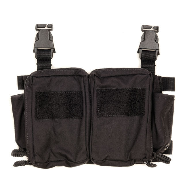 The HRT Maximus Placard was designed to attach to our HRT HRAC plate carrier or work in conjunction with Duraflex buckle system. Our Maximus Placard features triple 5.56 magazine inserts along with two handgun magazines with polymer inserts. The Maximus placard also features two general purpose zipper pockets on the front. The back face of the placard is a Hook face to mate with a Loop face of the front of a carrier or vest to keep it securely in place. The Maximus placard is made from 500 Denier Cordura and has an integrated Duraflex Buckle attachment system.